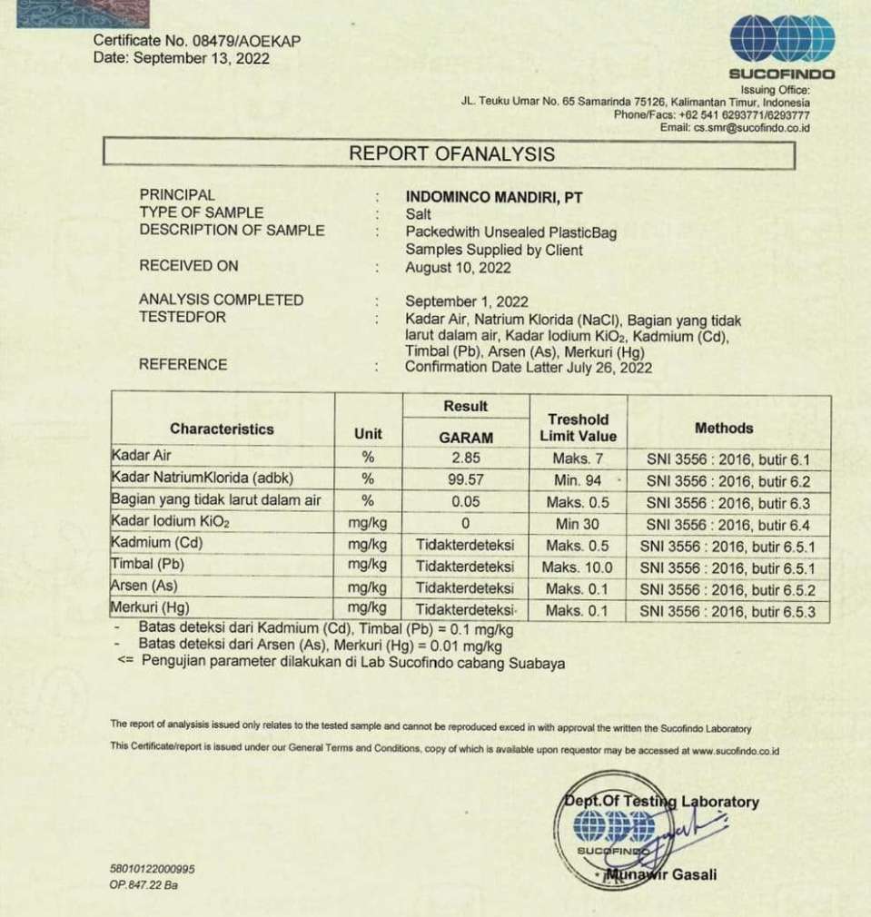 Garam Industri (CoA) Sampel diuji untuk berbagai parameter kualitas, meliputi kadar air, kandungan natrium klorida (NaCl), bagian yang tidak larut dalam air, kadar iodium (KI₀₂), serta logam berat seperti kadmium (Cd), timbal (Pb), arsen (As), dan merkuri (Hg). Pengujian ini bertujuan untuk memastikan kesesuaian produk dengan standar mutu dan keamanan yang berlaku.